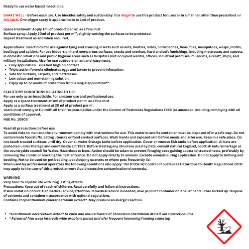 This product contains 3 (yes 3!) active ingredients! The most important of which is an I.G.R. (insect growth regulator)which makes the development of eggs impossible once in contact with this amazing insecticide. It also has a high residuality, in other words it stays in place, killing insects for weeks on end!